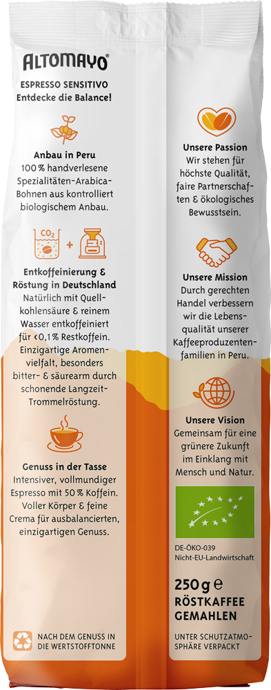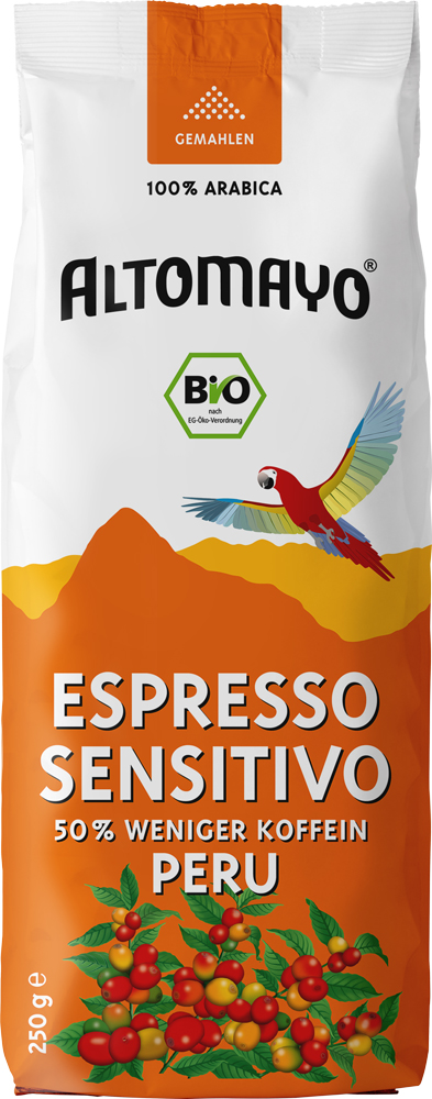 Good morningafternoonevening! The new Espresso Sensitivo from Altomayo offers you pure espresso enjoyment that is ideal for any time of day, and with 50% less caffeine, there’s no need to regret having that extra cup. The secret to its fine flavour: Before being carefully roasted, 50% of the premium, organic, Peruvian highland Arabica beans are decaffeinated using an exceptionally gentle process. The result: A full-bodied, intense treat offering a long-lasting taste, thick crema and pleasant feeling.