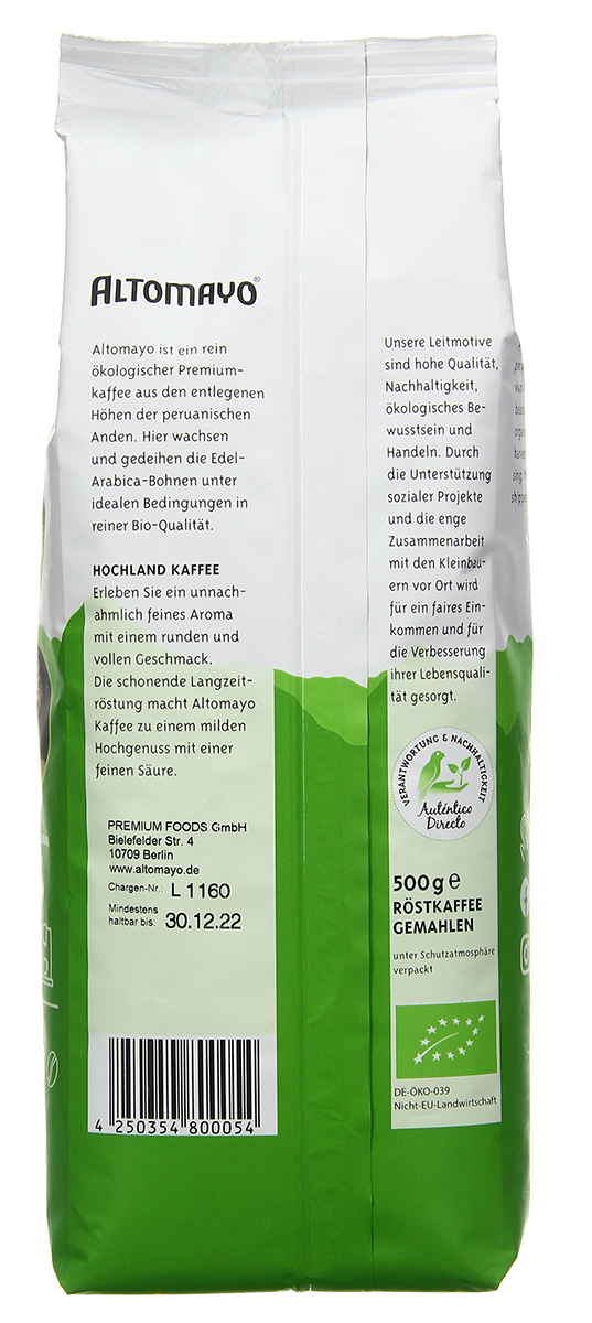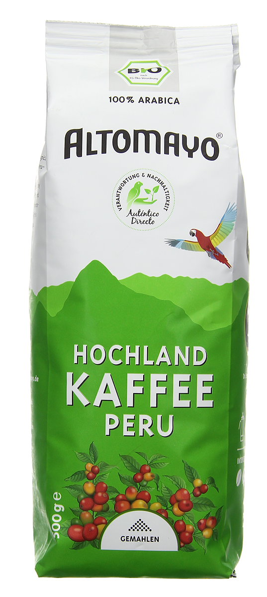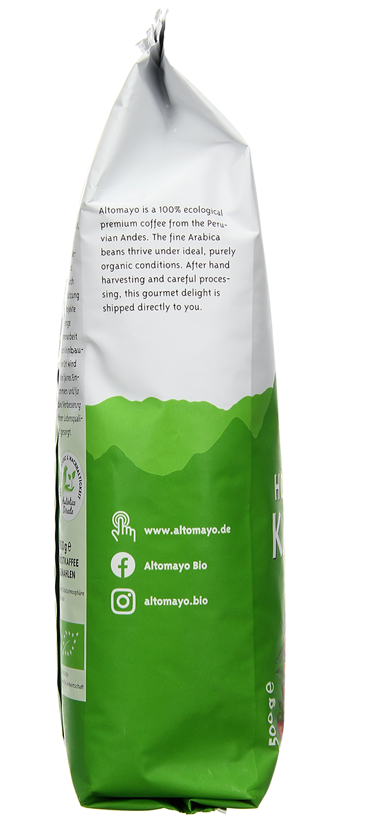 Thanks to the slow roasting process used, our ALTOMAYO organic highland coffee is especially low in irritants and acid. Aromatic enjoyment for coffee lovers. Day after day. Whether brewed by hand or by machine – this is a delicacy straight out of Peru.