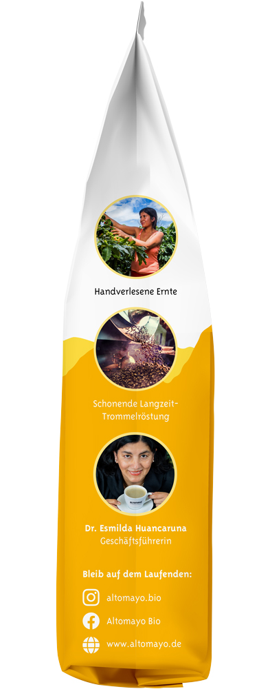 The green coffee beans are decaffeinated using only natural carbon dioxide and pure water. This special, patented process significantly reduces the amount of bitter substances and lowers the roasted coffee’s caffeine content to less than 1%. This makes it a mild, gentle treat with an exquisite taste and beautiful crema. Entirely organic, direct from the north of Peru and strong in flavour, even with almost no caffeine. A delight for enjoying at any time of day.