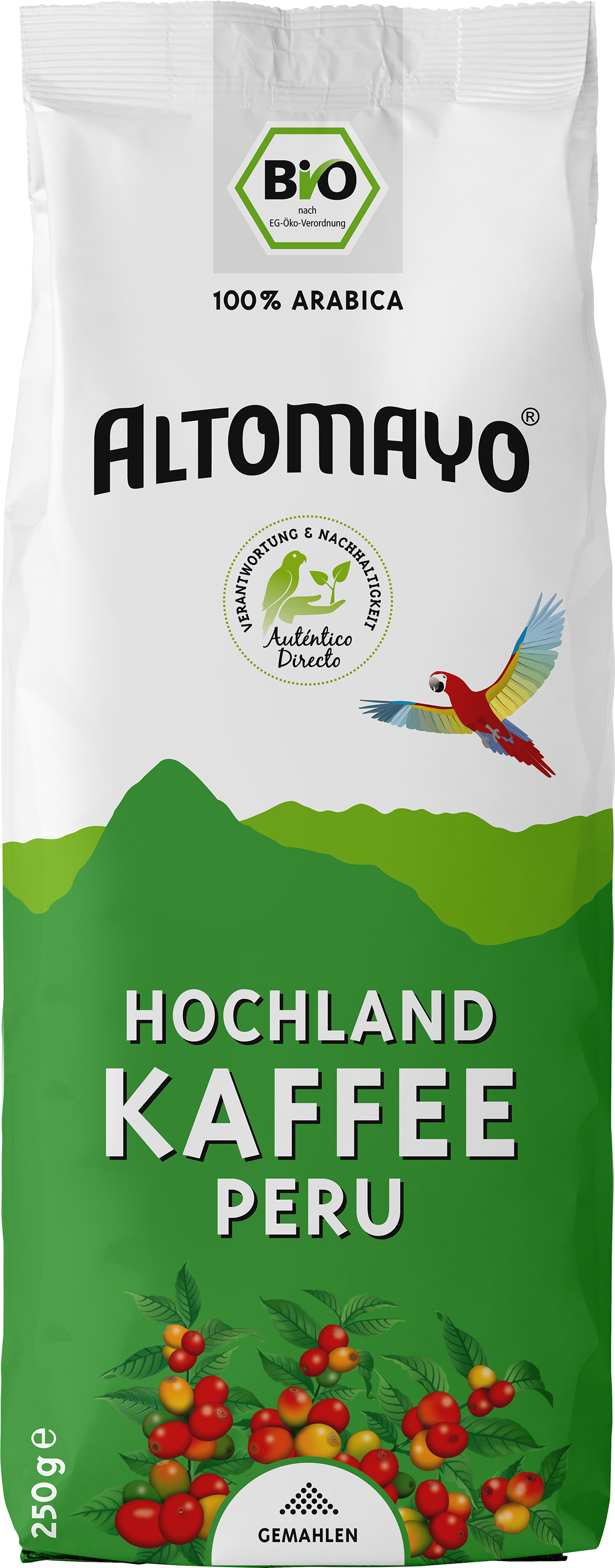 Thanks to the slow roasting process used, our ALTOMAYO organic highland coffee is especially low in irritants and acid. Aromatic enjoyment for coffee lovers. Day after day. Whether brewed by hand or by machine – this is a delicacy straight out of Peru.