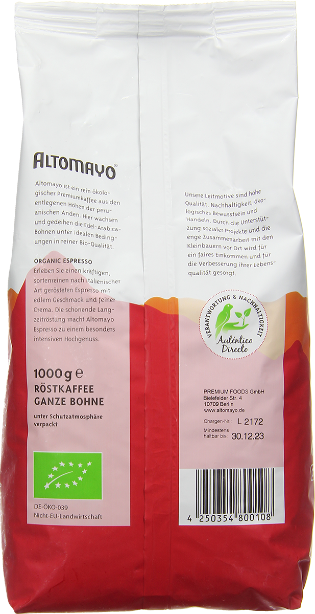 This organic espresso is a bold, single-origin espresso, which has been roasted the Italian way and offers exquisite flavour and a fine crema. The use of 100% highland Arabica and a slow roasting process makes ALTOMAYO espresso an especially intense treat.
